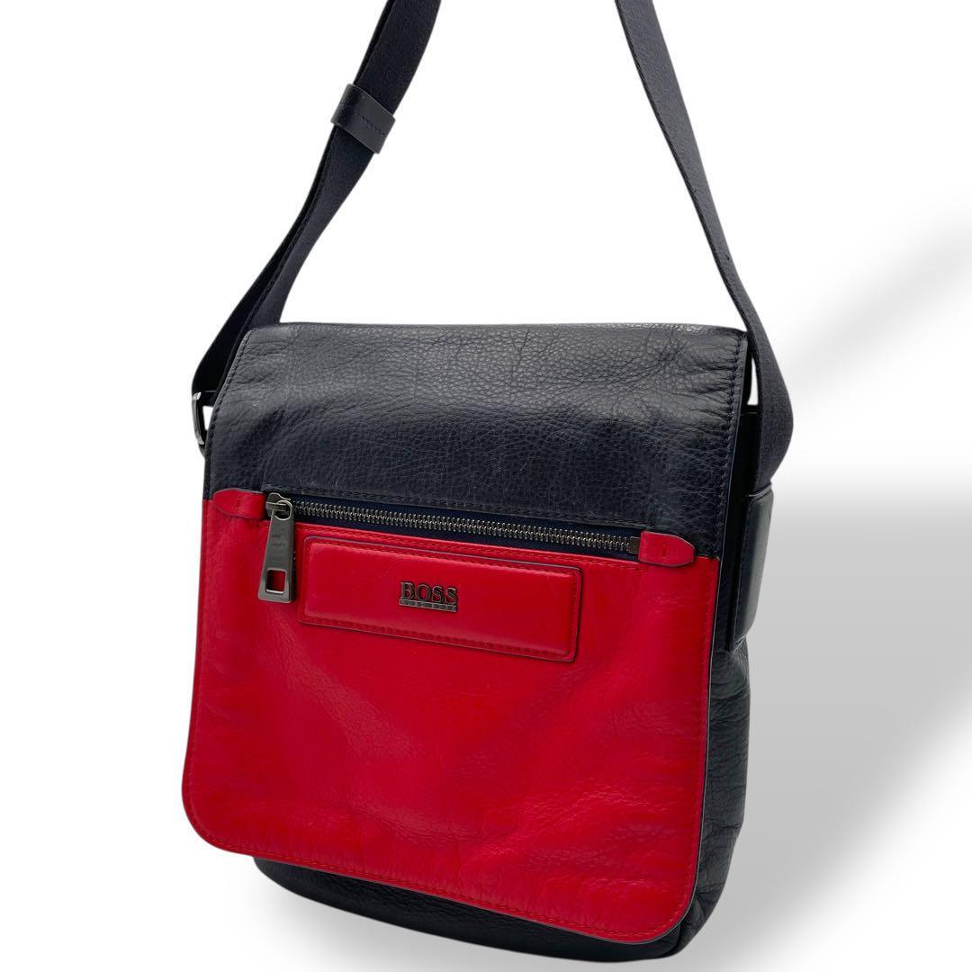 - 良品 HUGO BOSS メッセンジャーバッグ レザー レッド