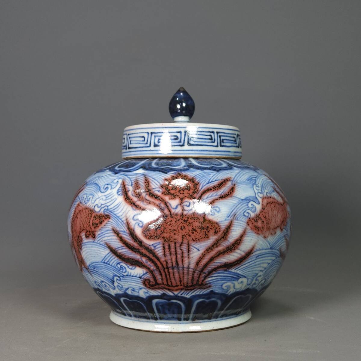 - 9_YF0091【惠】人間国宝 中国骨董 陶芸 磁器【明宣徳青花釉里紅海水魚藻紋蓋缶】工芸品 施釉陶 青花磁 陶芸 置物 收藏品