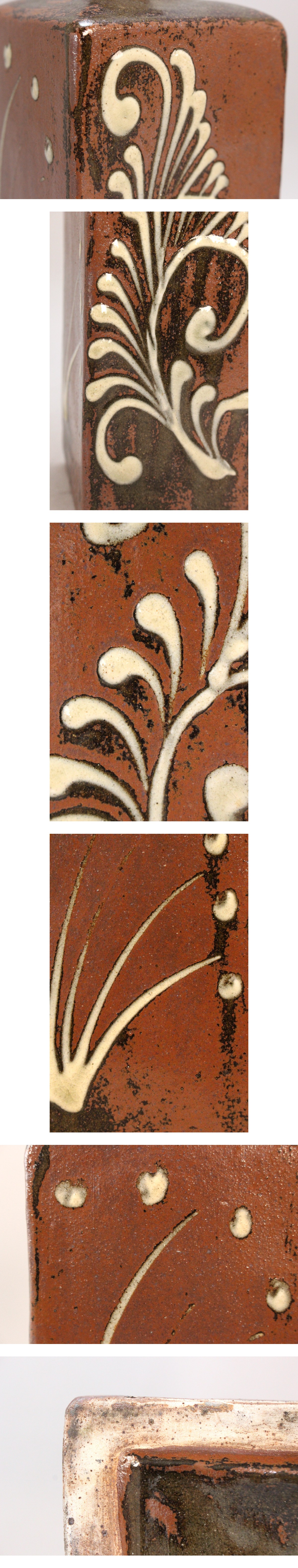 > [172480]壺屋焼 金城敏雄 イッチン 筒描唐草文角瓶 高さ24.5cm 陶印有◆金城次郎実弟/琉球/沖縄/やちむん/花器/酒器/壷/民藝/陶磁器/うぶ品