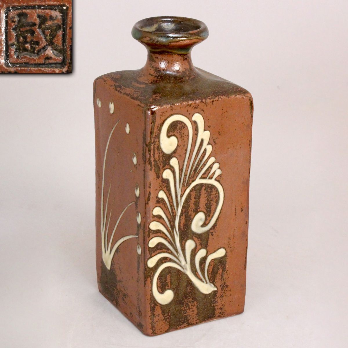 - [172480]壺屋焼 金城敏雄 イッチン 筒描唐草文角瓶 高さ24.5cm 陶印有◆金城次郎実弟/琉球/沖縄/やちむん/花器/酒器/壷/民藝/陶磁器/うぶ品