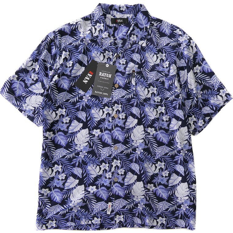 - 新品 ミスターヴァン 25年春夏 半袖 レーヨン アロハ シャツ L 紺 【va252062_79_L】 MR.VAN 総柄 花柄 オープンカラー 開襟 シャツ ロゴ