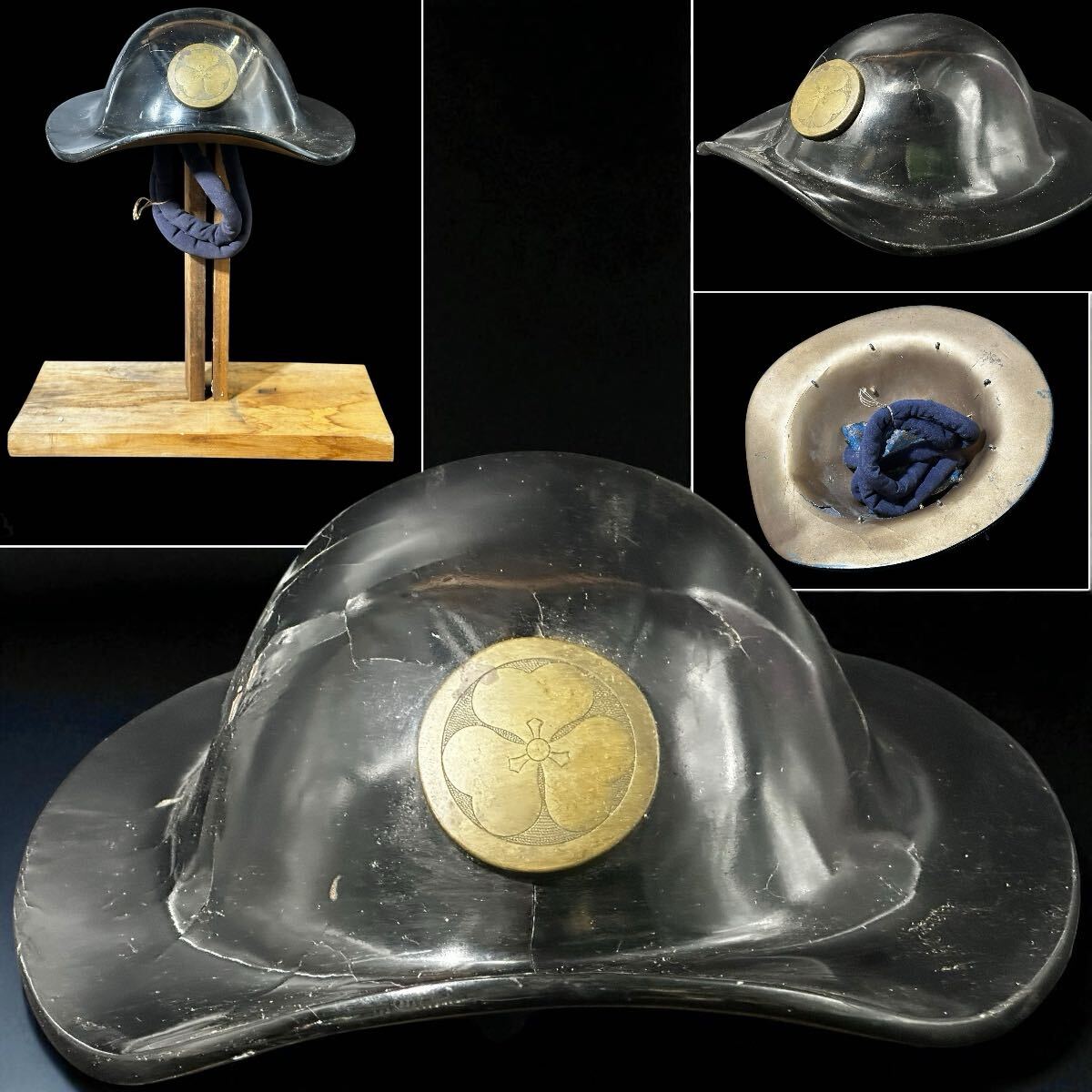 - 陣笠 時代武具 甲冑/鎧装具 丸に片喰紋 真鍮立体家紋 黒漆塗 内金塗 骨董 古美術