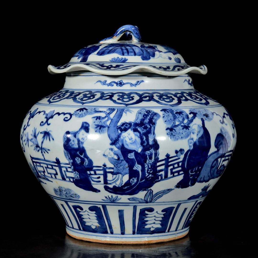 > 9+GV9769「東洋美術」 中国骨董 磁器製品【物語のような模様が描かれた青と白の蓮の葉の壺】 旧物 孤品 珍品 陶磁器 収蔵価値が高い