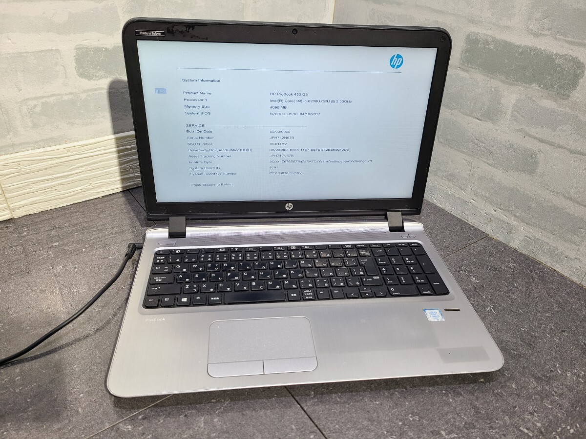 > 【現状品】管2T102 hp ProBook 450 G3 CPU core i5-6200U Bios起動OK HDD無し、HDDマウント有り、メモリー4GB、バッテリー有り