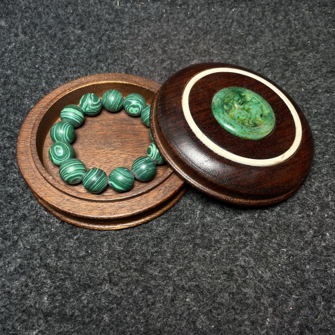 - ◆珍蔵◆中国古美術 清時代 孔雀石手串 手鏈 黄花梨木盒 細密細工造 置物 擺件 古賞物 骨董品 時代物 AT17