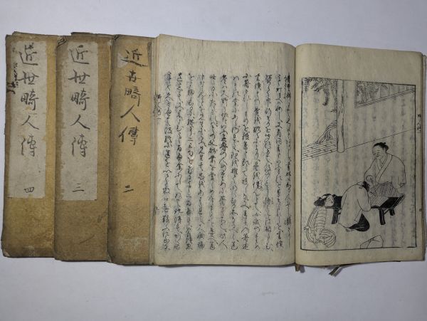 - 「近世畸人伝 第1-4巻」伴蒿蹊 三熊思孝 寛政2年序 4冊|伝記 歴史 奇人 絵入り 木版画 江戸時代 古書 和本 古典籍