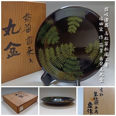 - 【T-480】讃岐漆器 高松翠松園工房 塩田宏 作 蒟醤歯朶文 丸盆 共箱付 茶道具