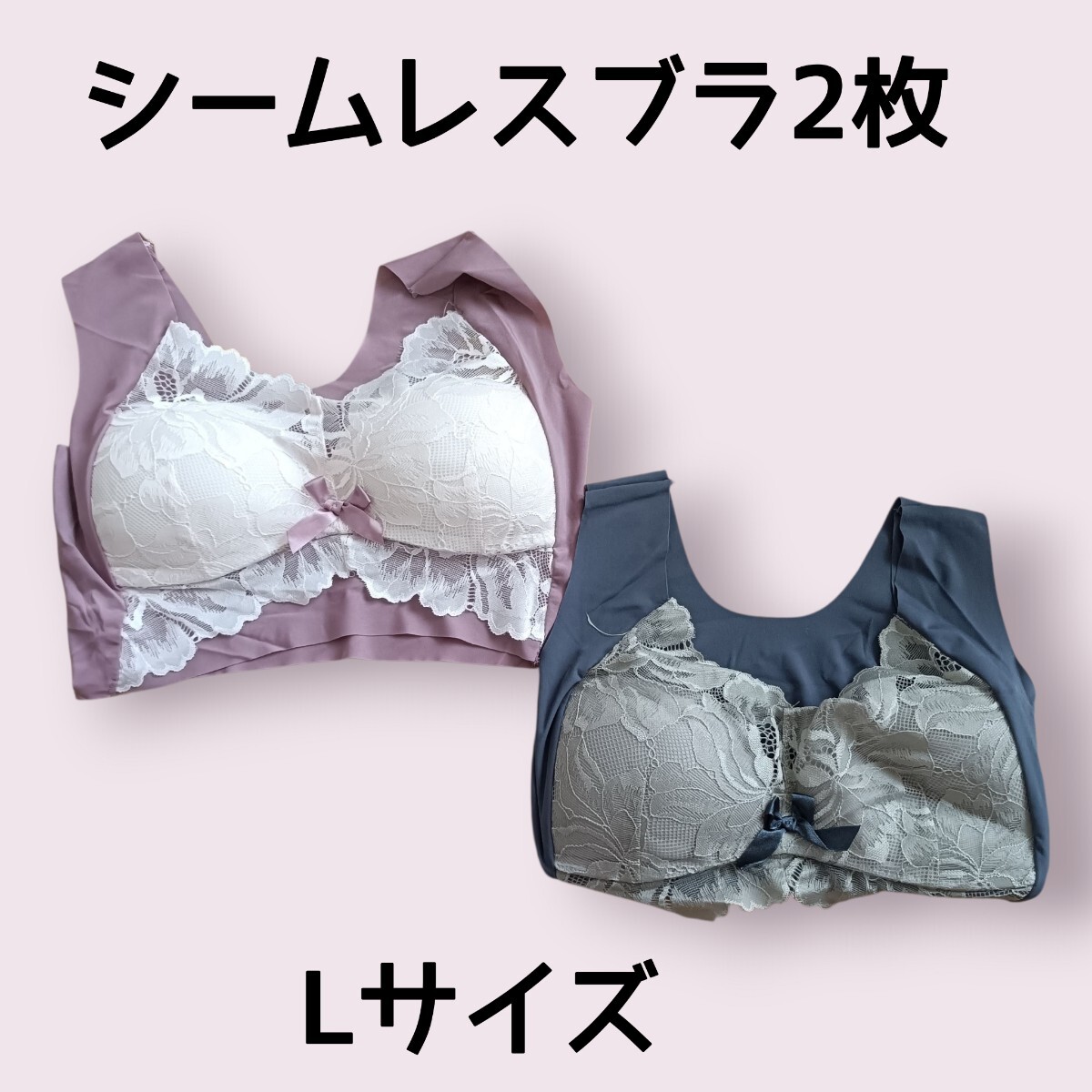 - 【在庫処分】くすみピンク・グレー?ブルー系2枚 ノンワイヤーブラ 2枚セット Lサイズ レースデザイン ナイトブラ