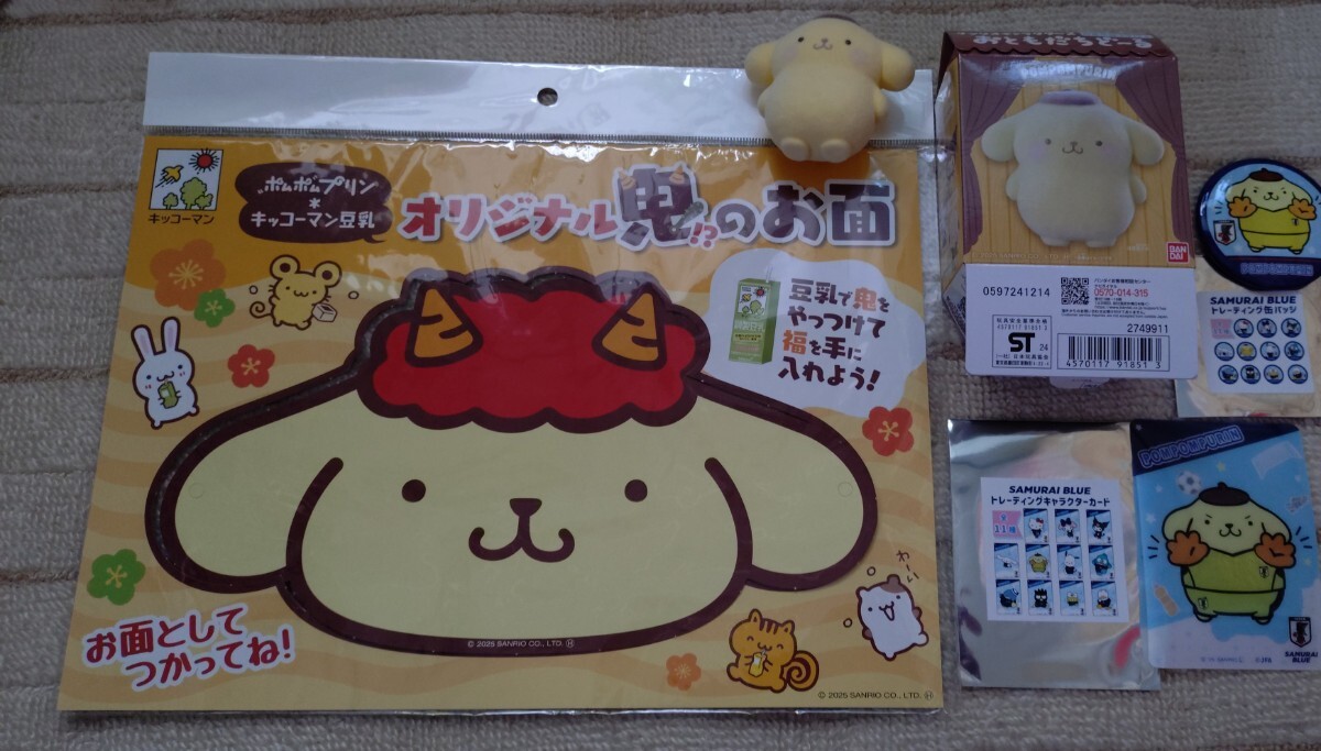 - サンリオ ポムポムプリン フロッキードール(フィギュア)&クリアトレーディングキャラクターカード&缶バッジ&鬼のお面