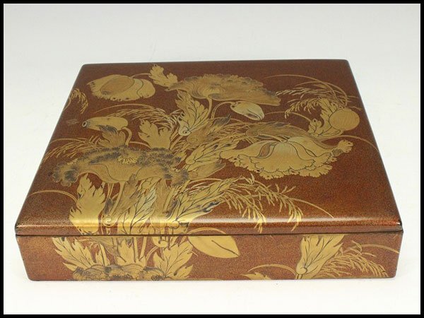 - 【金閣】蓮花蒔絵 時代 硯箱 瓢硯 桃形水滴 揃い 文房四宝 旧家蔵出 送料無料(AZ987)