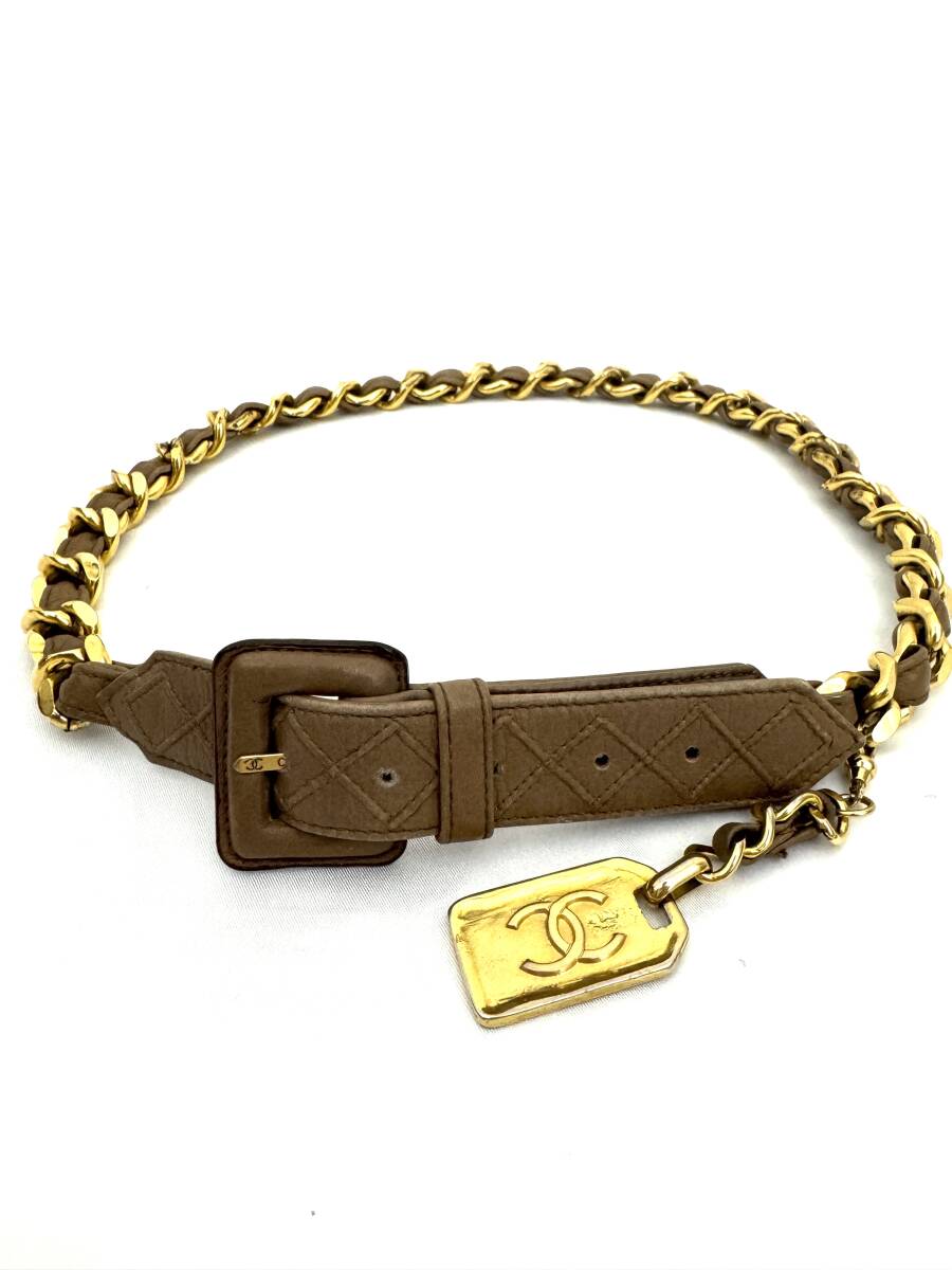 - 7I2812【本物保証】シャネル チェーン ベルト チャーム 付き カンボン ロゴ ココマーク ビコローレ レザー ブラウン 85/34 CHANEL