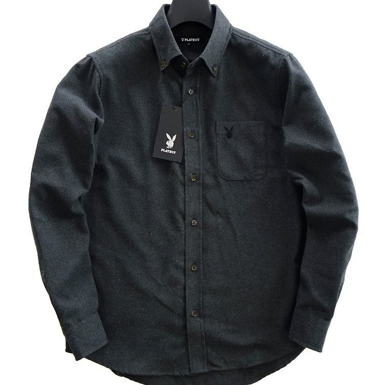 - 新品 プレイボーイ 秋冬 起毛 ビエラ シャツ M 濃灰【44003_98_M】 PLAYBOY メンズ 長袖 フランネル ネルシャツ ボタンダウン 無地