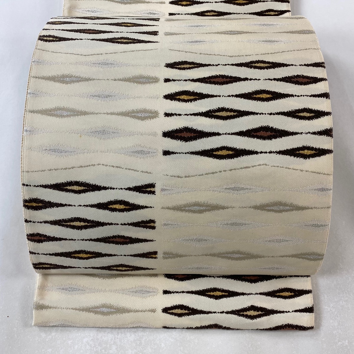 - 袋帯 逸品 洛陽織物 落款 月絖綴 リバーシブル よろけ縞 七宝 金銀糸 刺繍 ベージュ 六通 正絹 【中古】