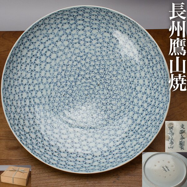 - 【千f868】長州 鷹山焼 大皿 幅約35cm 「文政年製 長州鷹山」在銘 合箱 染付 皿 山口県 藩窯 江戸時代