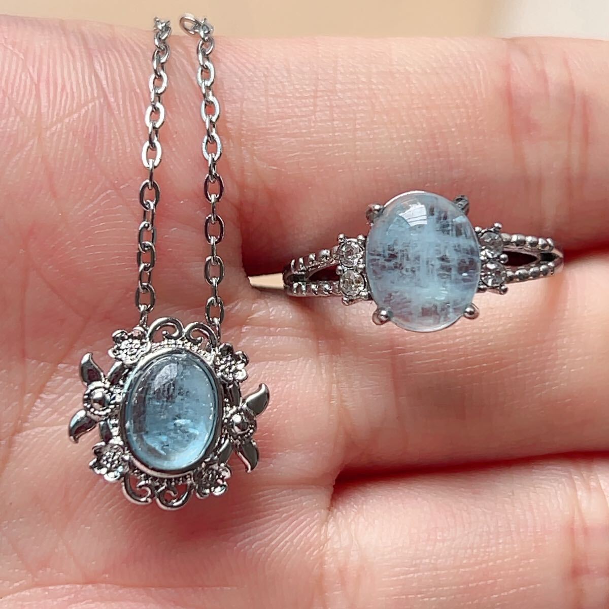 - ◇アクアマリン◇リング+ネックレス 二点セット◇天然石◇パワーストーン◇巾着袋付◇プレゼントにも 038S9298