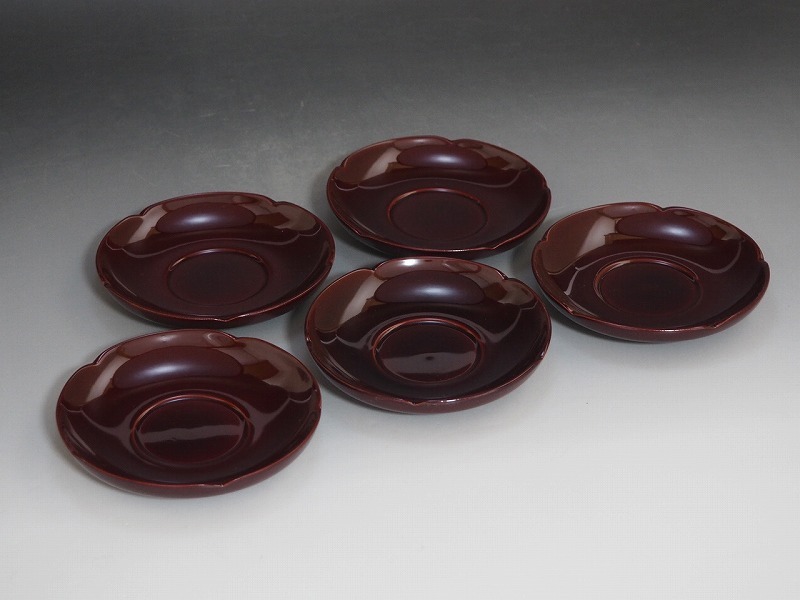 - A4476 溜塗 梅形 茶托 5客揃 ☆ 茶器 煎茶器 煎茶道具 和食器 応接具 木製 木地 木工芸 漆器 漆芸 煎茶托 托子 茶台 茶托子 美品 良品 無傷