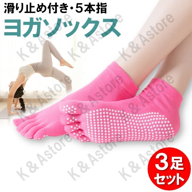 - ヨガ ソックス 5本指 滑り止め付き 靴下 ピラティス レディース 冷え対策 室内 スポーツ用 運動用 トレーニング ジム ピンク 3足セット