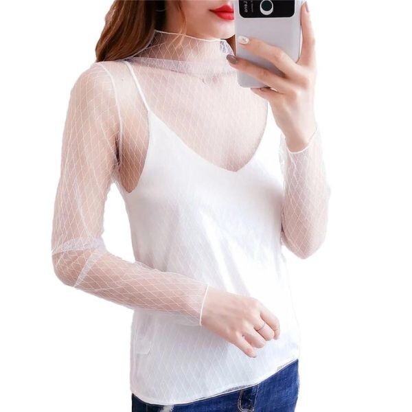 - トップス シースルー 長袖 総レース ハイネック レディース 透け透け ブラウス インナーフリーサイズ 網柄 ホワイト