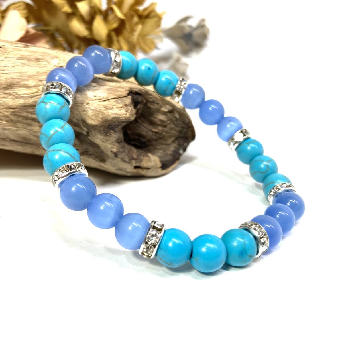 - ターコイズ&キャッツアイ(ブルー)パワーストーン ブレスレット(シルバー)メンズ レディース 男性 女性 開運 数珠 お守り