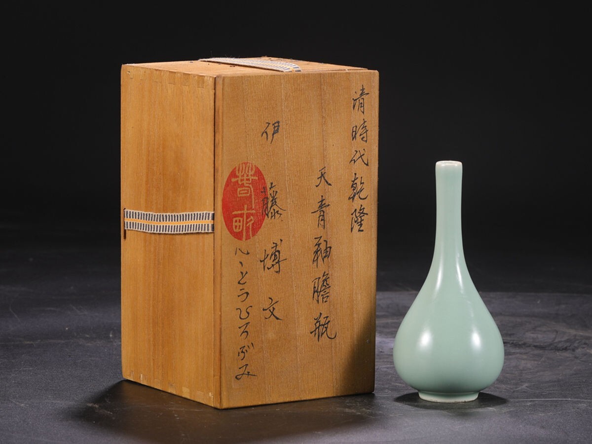 - 「清 乾隆年製 陶磁器 天青釉 膽瓶」染付 置物 擺件 古賞物 中国古美術 旧蔵出