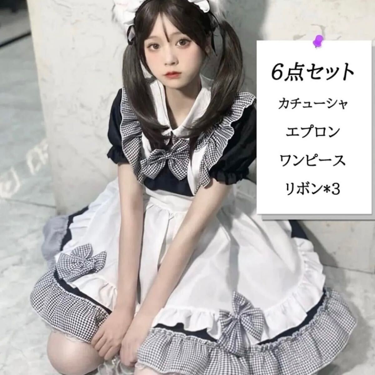- ロリータ メイド服 チェック柄 コスプレ 半袖 制服 喫茶店 日常 萌え 仮装 蝶結び アリス風 lolita 衣装 コスチューム 黒白 ハロウィン