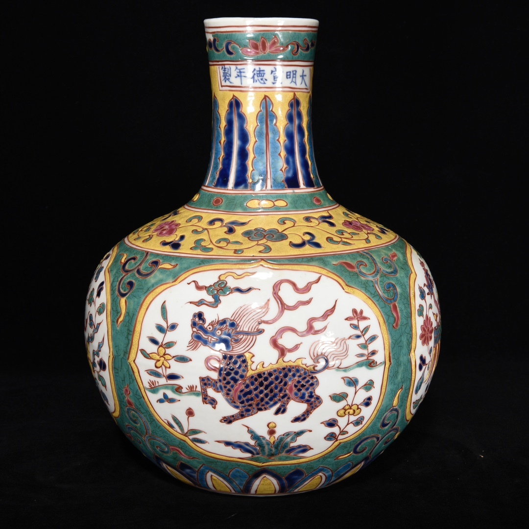 > 『館蔵珍品 明 宣德年製款 古陶瓷品 五彩麒麟鳳紋 天球瓶 陶芸』稀少珍蔵品 古賞物 貴重物品 収蔵品 中国古美術 時代物 古董品