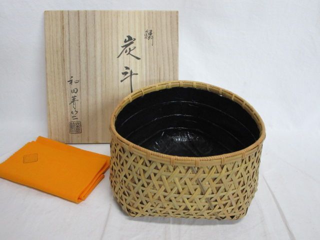 - 雉坂★【 鱗 炭斗 竹工芸家 和田青竺 共箱 共布あり 風炉用 】茶道具・炭道具・炭点前・竹細工・竹編・竹籠