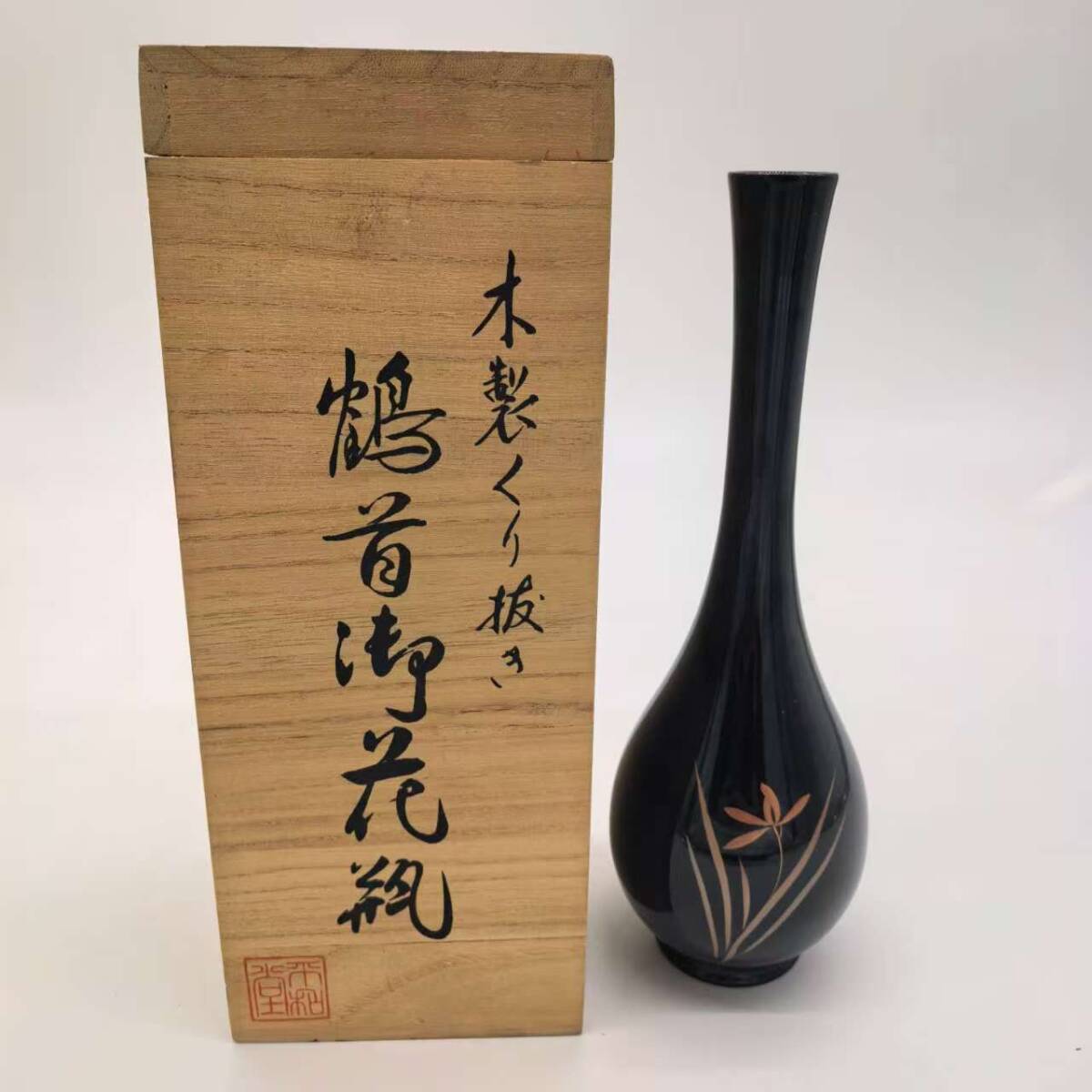 - 伊予伝統工芸 桜井漆器 木製くり抜き 鶴首御花瓶 共箱付