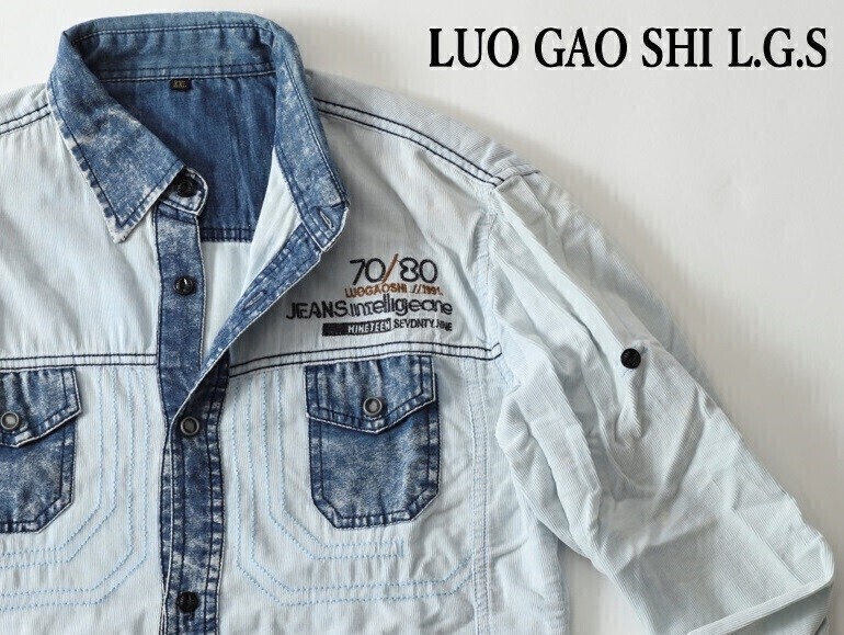 > ★中古★LUO GAO SHI ルオ・ガオ・シー★ダメージ色落ち加工両ポケット付長袖コーデュロイシャツXXL★ウォッシュドブルー水色【本物保証】
