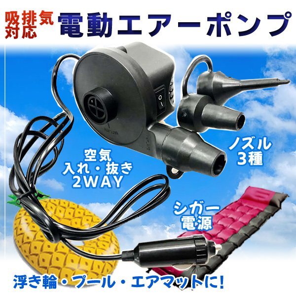 - シガー電源 DC 12V 電動空気入れ エアーポンプ ノズル3種 / 自動空気入れ シガーソケット 浮き輪 風船 プール キッズフロート エアポンプ