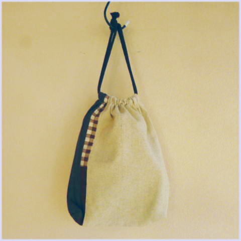 - 【入学、入園!】450円ベージュと茶チェックパッチワーク巾着袋 【手作り小物】