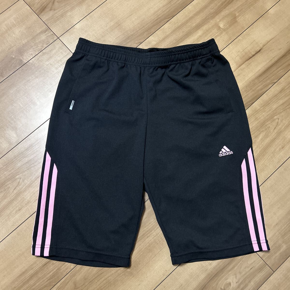 - 美品 adidas アディダス ハーフパンツ OTサイズ ピンク スリーライン ブラック ジャージ 短パン 黒 サイドライン