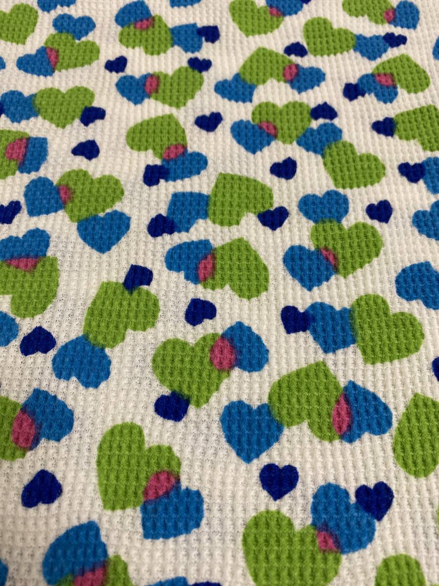 - ニット生地はぎれ ワッフルニット ハート柄 グリーン×ブルー 50cmカット