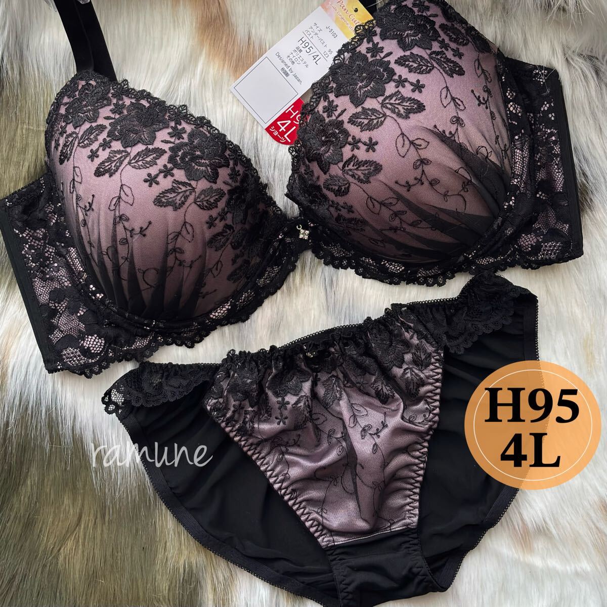 > ラスト【H95 4L ブラック】新品 ブラ&ショーツ ブラジャーショーツ モールドカップ内蔵 大きいサイズ 花柄刺しゅう レース 透けパンティ