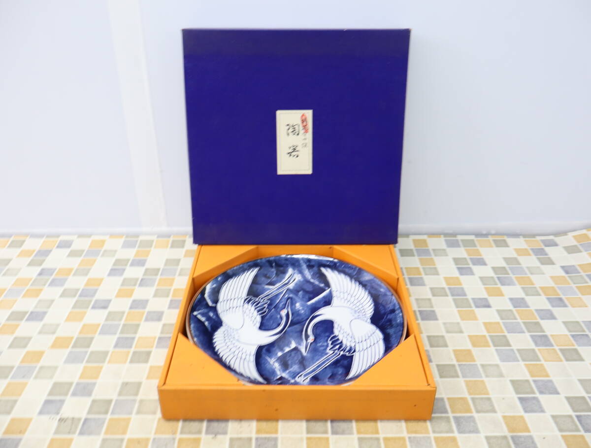 > △陶磁器 骨董 古美術|マル美窯 大皿 飾り皿 2羽 縁起物|有田焼 ツル 鶴|和食器 食器 盛皿■O4767