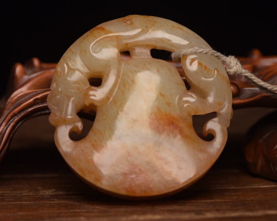 - 『館蔵珍品 和田玉製 細密彫 紅沁 龍環 置物 賞物』文房具 書道品 貴重物品 収蔵品 中国古美術 時代物 古董品