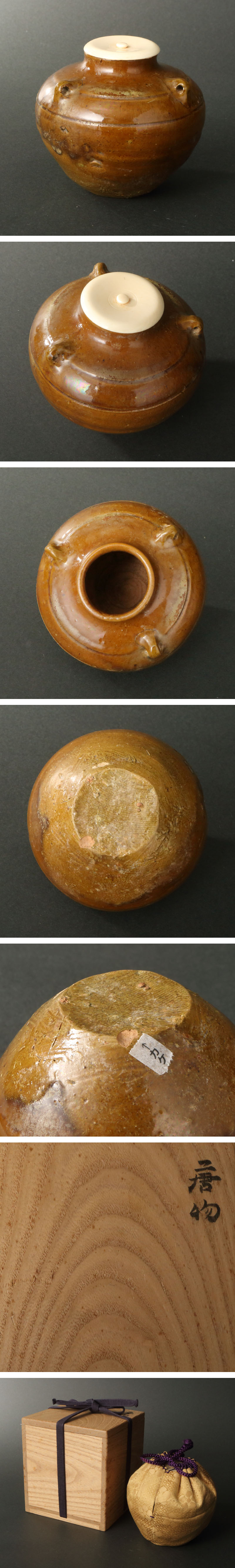 > 委託HK◇時代 唐物三耳茶入 ※仕覆添え(茶道具 陶磁器 陶芸 中国 朝鮮 李朝 宋 唐物 茶器 棗 抹茶 濃茶 耳付 茶杓 茶事 点前 古物 骨董)