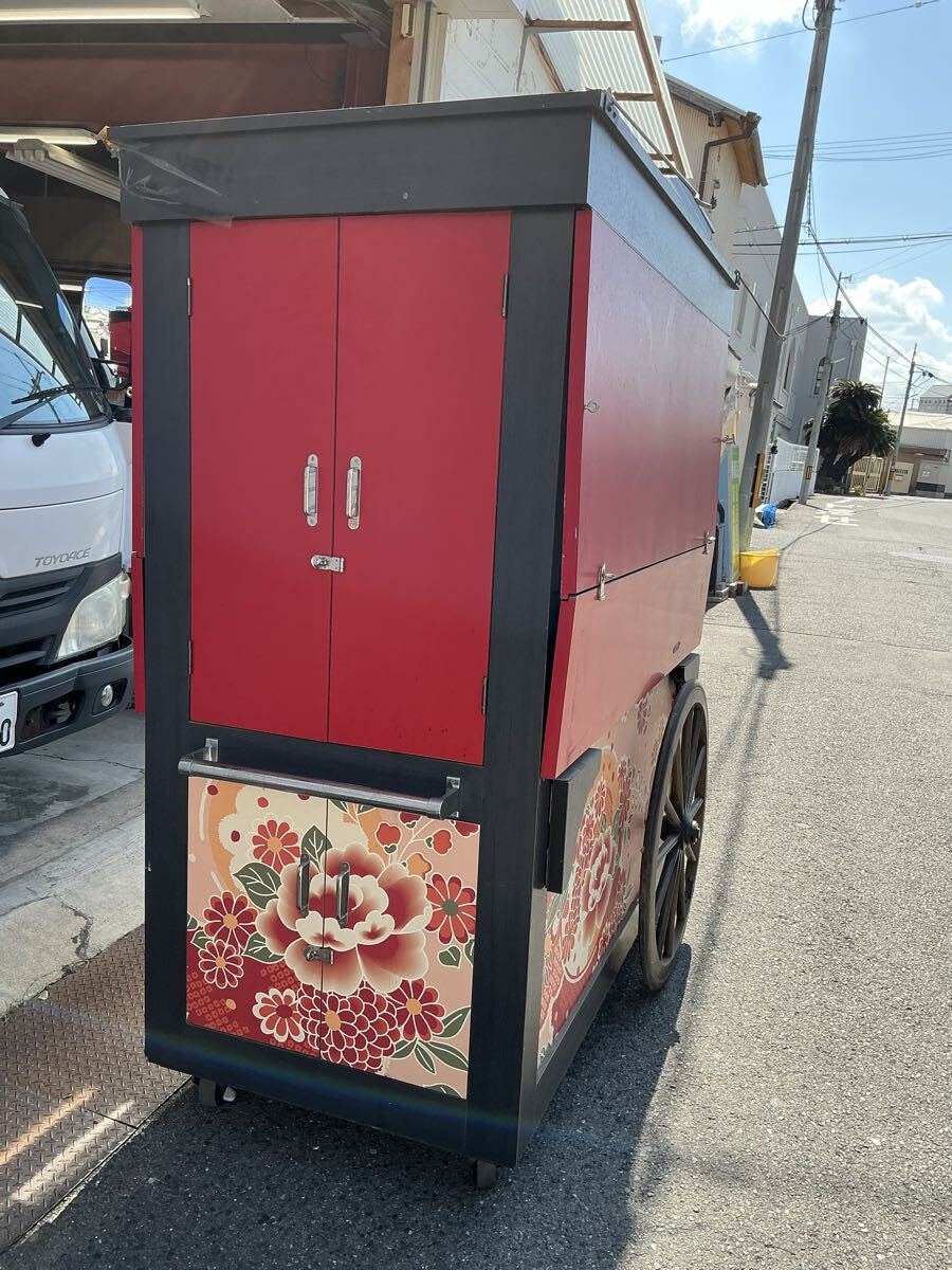 - 【L直B657】引き取り限定 販売移動式カート 商品陳列台 ディスプレイ 和柄 ワゴン リヤカー 台車 屋台 車輪