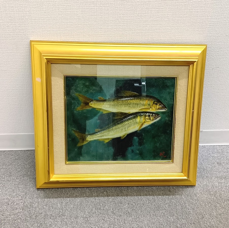 - 【4598】真作 柴原皖 鮎 アユ 油彩画 油絵 絵画 魚画 額装 画寸 約26cm×21cm アート