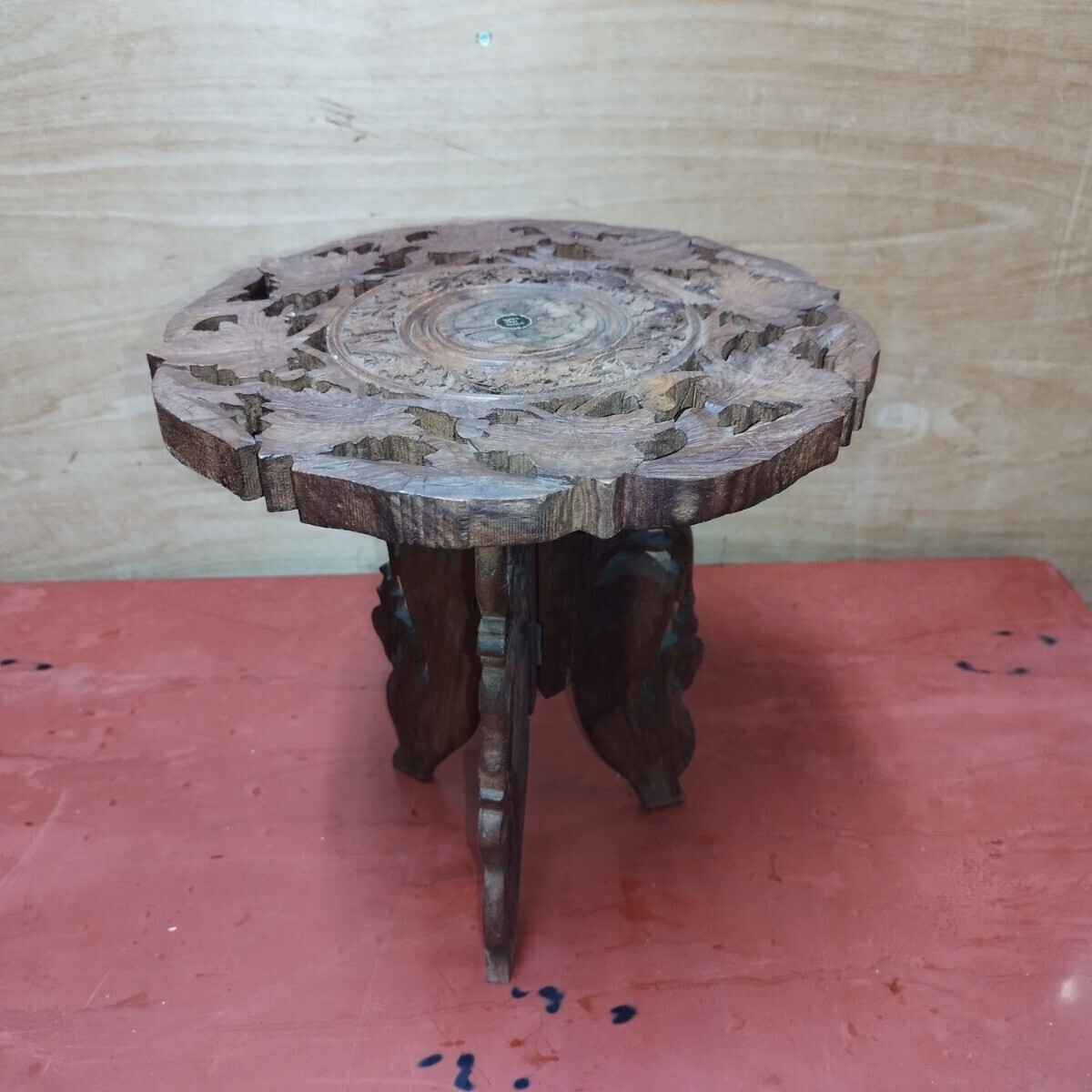 - 戸05d インド 木彫り 木製 花台 飾り台 高さ約32cm 直径約30cm 折りたたみ サイドテーブル アンティーク