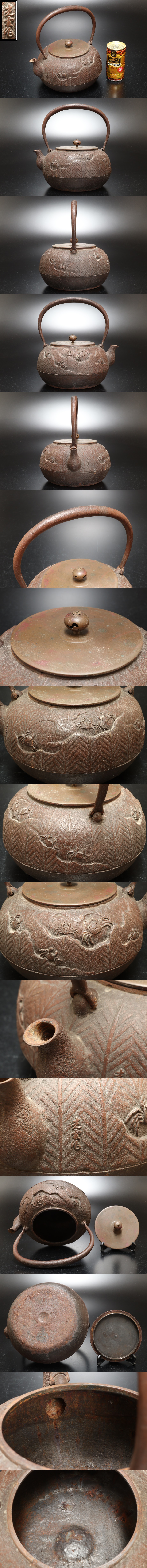 - S674 煎茶道具 光雲作 虫喰摘 斑紫銅蓋 蟹籠図 鉄瓶 重量1835g