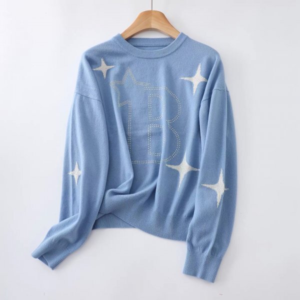- wnm ウール100% ニット セーター チュニック 貼り付けビーズ 薄手 フリーサイズ ゆったり 肌触り抜群 水色