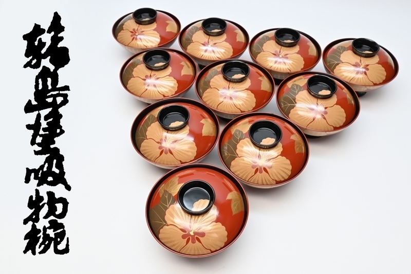 - 輪島 高級 吸物椀 ■ 伝統と技術の輪島塗 蒔絵椀 [ ハイビスカス ] 木製 10客 ■ 天然木 お椀 漆器 茶道具 料亭 木箱入り ■