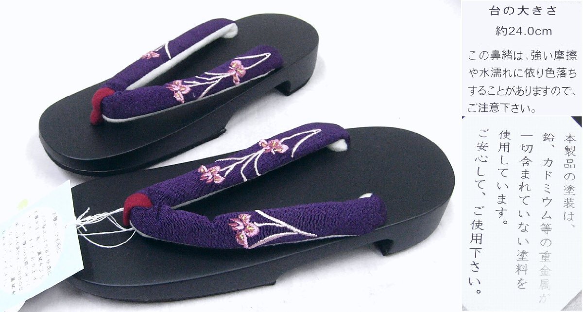 > アウトレット 23㎝~24.5㎝の方に 黒色台の下駄 1005 深紫色系刺繍鼻緒 未使用・わけあり品
