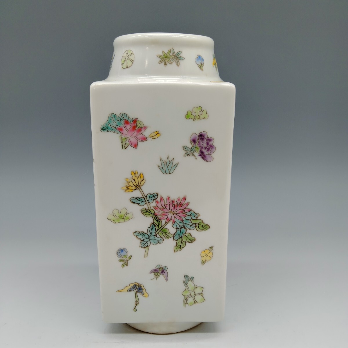 - 中国美術 中国景徳鎮製銘 粉彩蝶々紋四方花瓶 花入 飾壷 色絵 景徳鎮