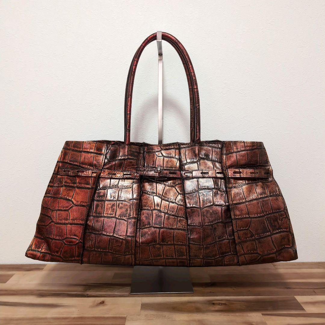 - ハンドバッグ クロコ 大型 大容量 日本製 本革 特注 フルートバッグ
