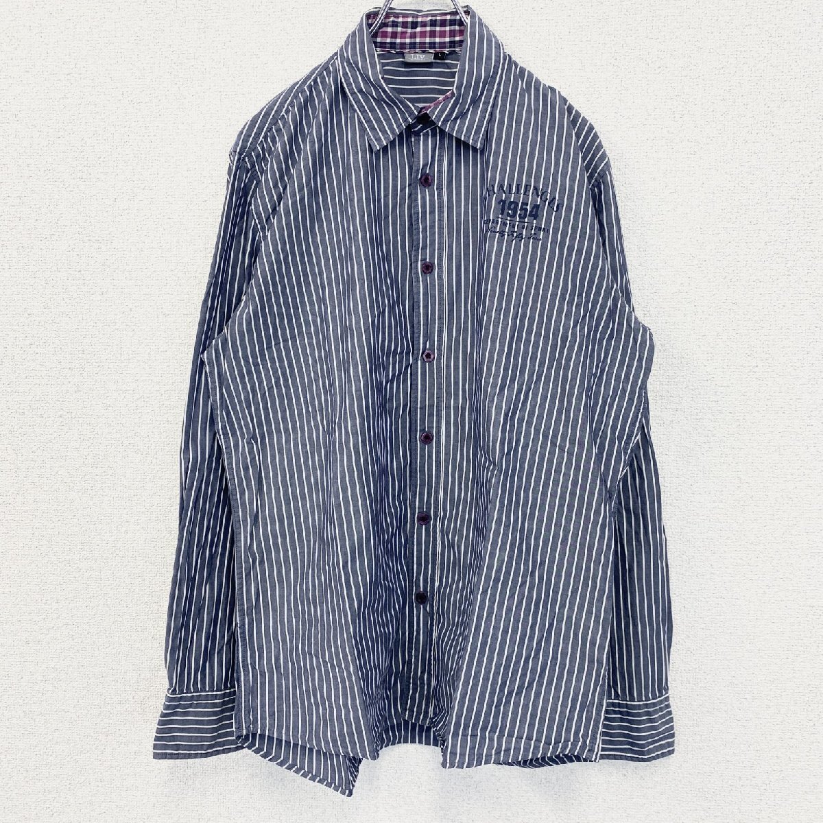 > 古着 used LIV ESSENTIALS 長袖シャツ ストライプ柄 グレー 白 ホワイト レトロデザイン Lサイズ