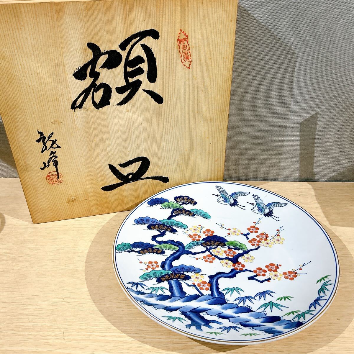 - ★有田焼 額皿 染錦 鶴 松竹梅 縁起物 陶器 龍峰 華山 直径39.8cm 共箱