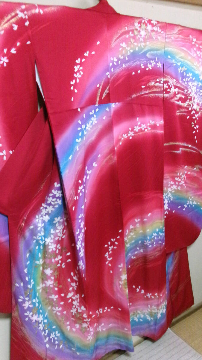 - 107【成人式】フランソワーズモレシャン氏デザイン※本振袖※紅赤桜模様※レインボー※現代着物※正絹※袷※振袖着物 丈165 裄69