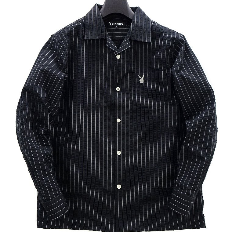 - 新品 プレイボーイ 25年春夏 シアサッカー オープンカラー シャツ M 黒【PB251032_98_M】 PLAYBOY 長袖 ロゴ ストライプ メンズ コットン